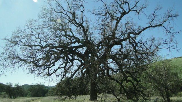 Finally, the live oaks begin once again to mix with the valley oaks, and you pass several impressive specimens on both tree on the way back to the trailhead. For those who don’t know the difference between valley and live oaks, valley oaks are deciduous, can grow to 100 feet, and can live over 400 years. It is common from the San Fernando Valley up through the Central Coast and into Northern California, where it begins to transition into the Oregon oak and blue oak, or into the Sierra foothills, where it eventually gives way to the sharp-leaved, smaller black oaks. Coast live oak grows within a short distance from the coast, and it grows well where there’s a decent amount of moisture available.Â