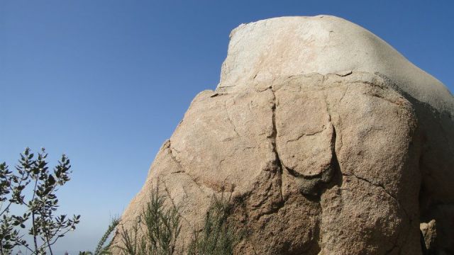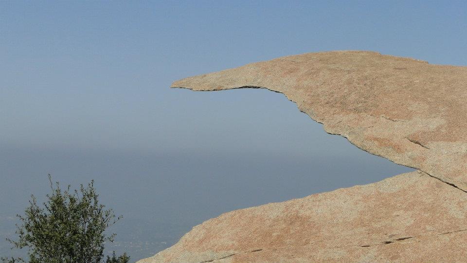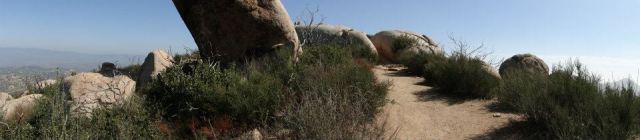 From there, you continue winding up ever-higher through a maze of boulders and chaparral until you approach the summit, which is covered in communications and broadcast antennae and some planted Coulter pines. At this point, you can find the semi-famous (at least in this part of the county) “potato chip rock,” a large flake of granite that remains hanging in mid-air after a huge chunk split from an underlying fault. This is a popular place for people to climb around and have their picture taken. Although, it’s only a matter of time before the rock comes crashing down, hopefully without some poor soul standing on top of it.