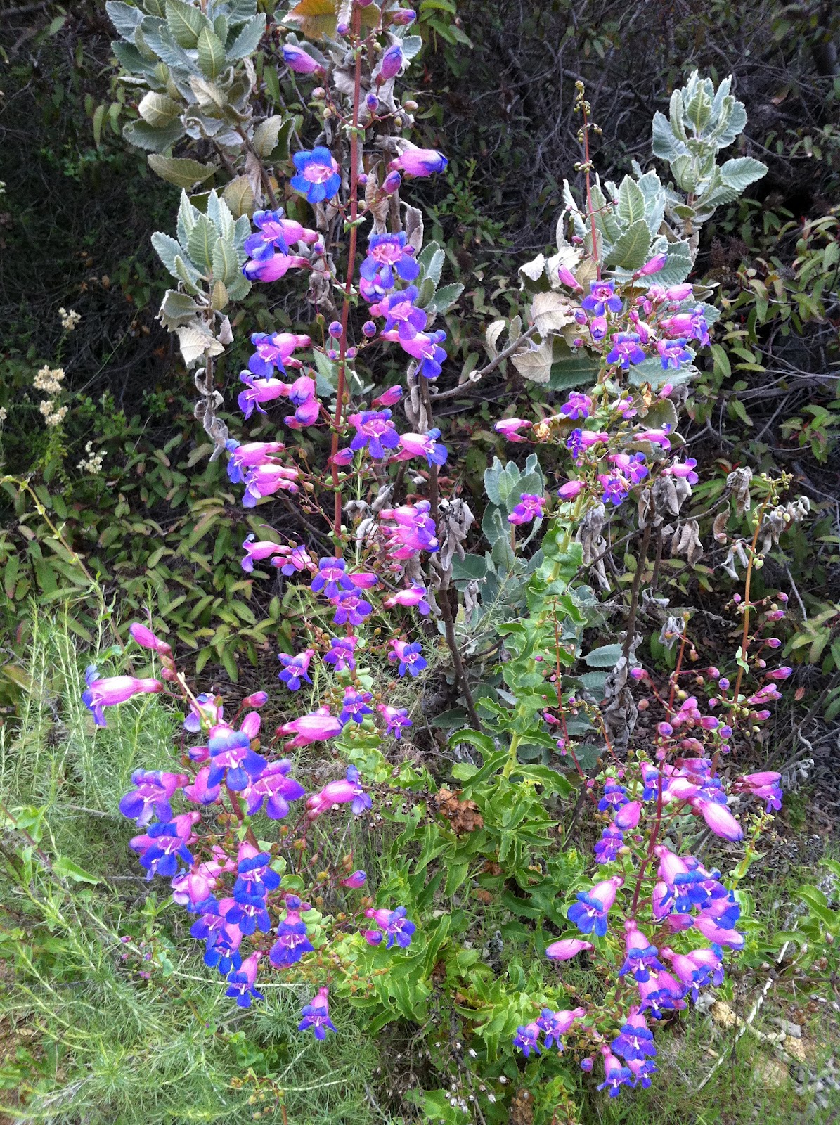 Even better, the wildflowers are going absolutely ape-crap crazy right now. I’ve grouched a little about chaparral here before regarding how I’m bored with it, but there’s nothing like a full-swing chaparral wildflower show to help you rediscover the magic. Everywhere I looked I saw thousands of flowers in red, orange, yellow, pink, lavendar, purple, light blue, deep-blue, grey-blue, shading from purple to blue, and white. Sage bloomed pale blue along side towering Mohave yucca plants sporting their creamy white and magenta tinged blossoms. The scent was heavy with the sweetness of a sea of flowers. Spring is at its peak right now in San Diego, and I hope everybody gets a chance to go out and see all of these fantastic displays.