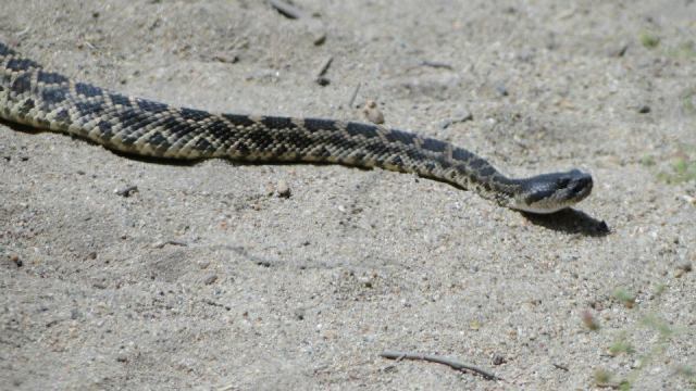 On the way back from this spot, I spotted a rattlesnake lying in the middle of the trail. I stopped at a respectable distance and waited for him to move away. I expected the snake to get up and go at the sight of me, but it decided it was not going to budge. I wasn’t going to take any chances walking past it either, since I know rattlers only strike when provoked, and my movement could be viewed as provocation. So, I settled for kicking a little sand at him. He clenched up, and his rattler set off immediately. If it’s possible for a snake to stomp its feet, this one did as it huffed off into the bushes, leaving the trail free of peril.