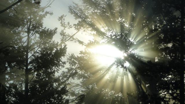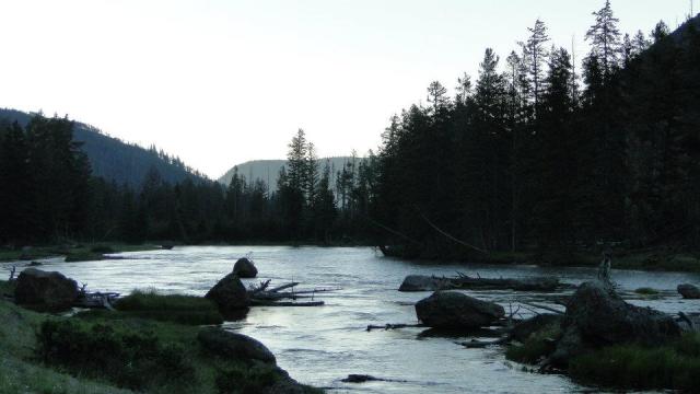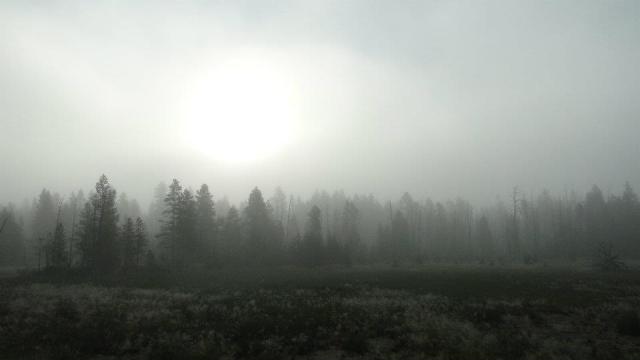 Kelly gracefully consented to wake up at 5:30 am in order to get to the park before 7. After coffee and a quick scramble, we hit the road and enjoyed the 45 minute drive into the park. We road along the Gallatin River, past the forest that is still recovering from the 1988 inferno that charred one-third of Yellowstone. Along the way, a number of small lakes threw mist in the air, and the light caught on the mist, creating a gorgeous light-ray patterns and silhouettes.