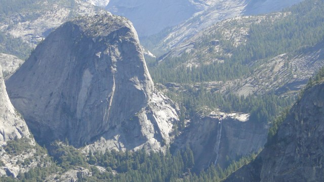 The most common and sensible way to hike this trail is to start at Glacier Point, which is 3,200′ above the valley floor, across Illhouette Gorge, and down the first stretch of the John Muir Trail, past the waterfalls and the ever-changing views of Half Dome, Little Yosemite Valley, Nevada Falls, and Liberty Cap. The less sensible way is to do it in reverse, beginning at Happy Isles, climbing up both falls, and then climbing all the way to Glacier Point.