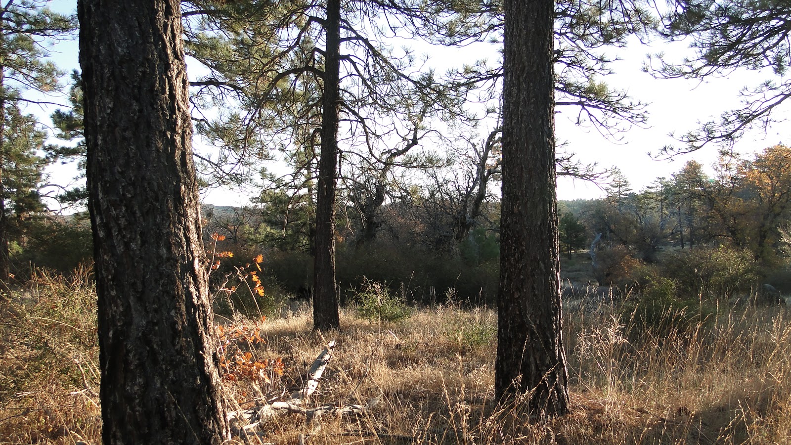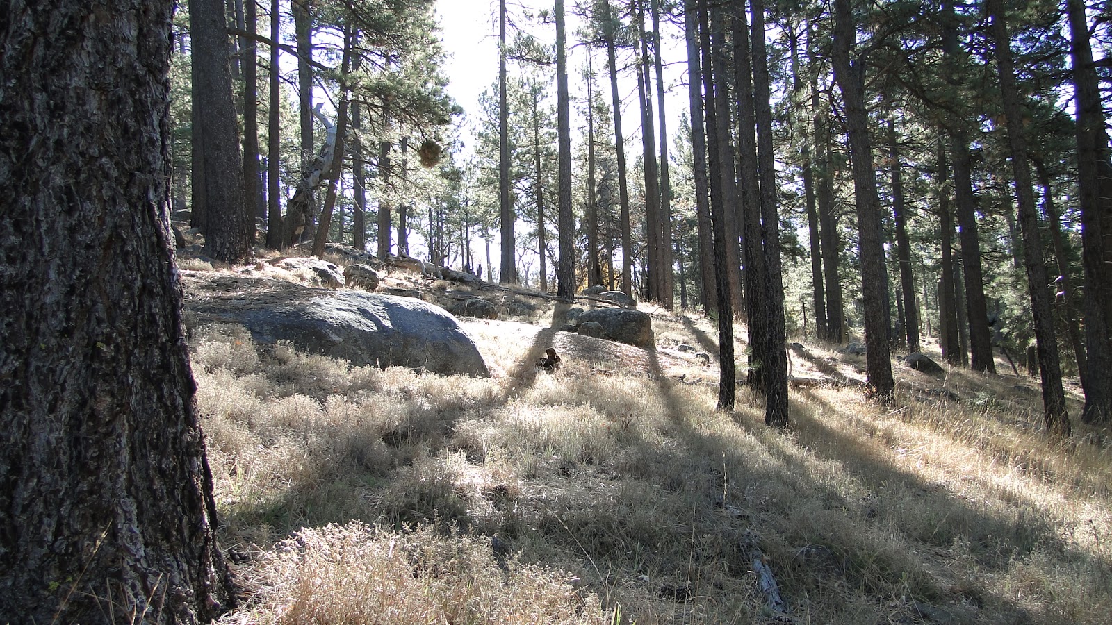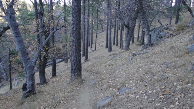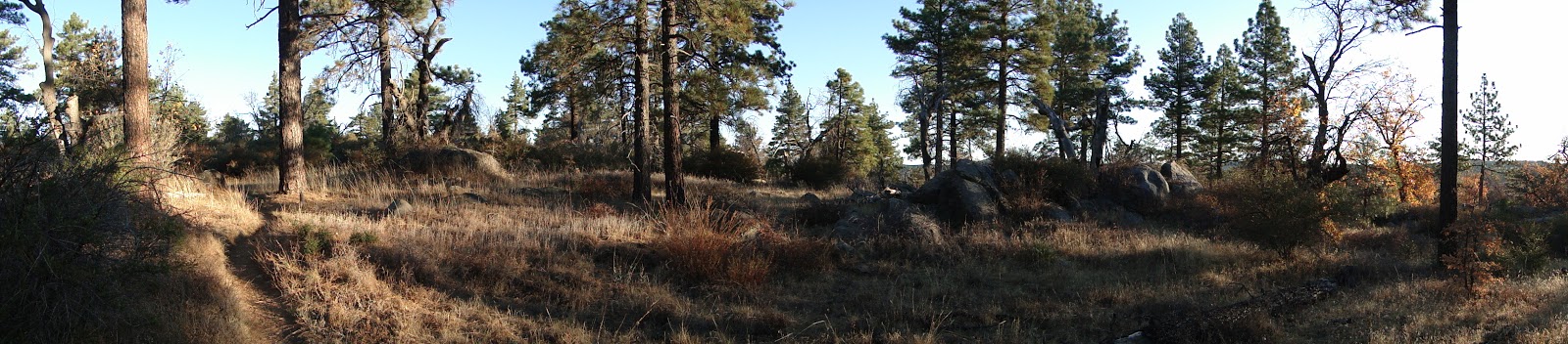 The majority of this trail was taken on the Sunset Trail, which hugs the western rim of the plateau and reveals views that reach the ocean when the air is clear enough. This trail goes up and down small ravines and through a tranquil forest of Jeffrey pine and black oak. There are numerous spots for views, which encompass the mountains west and south into Mexico.