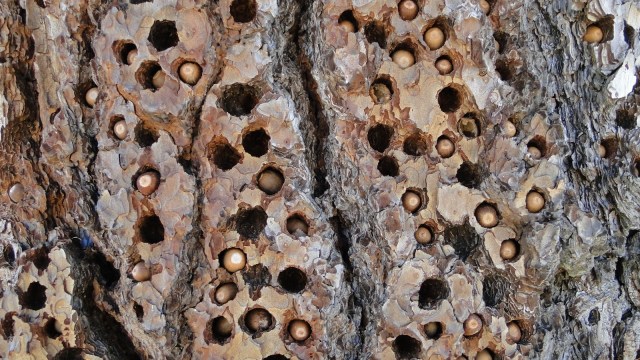 | Woodpeckers drill holes in trees to store acorns for lean times |