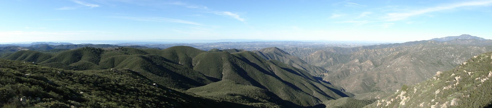 Soon, you come to an improved trail that traverses some steep, rocky stretches. Hiking poles are helpful here, since the balancing can be precarious. After the only major effort on the hike, you find yourself on the windswept peak, which is surrounded by canyons all around. Sitton Peak also offers good view of all the major Southern California Mountain ranges except for the San Gabriels, which are blocked from view by Santiago Peak.