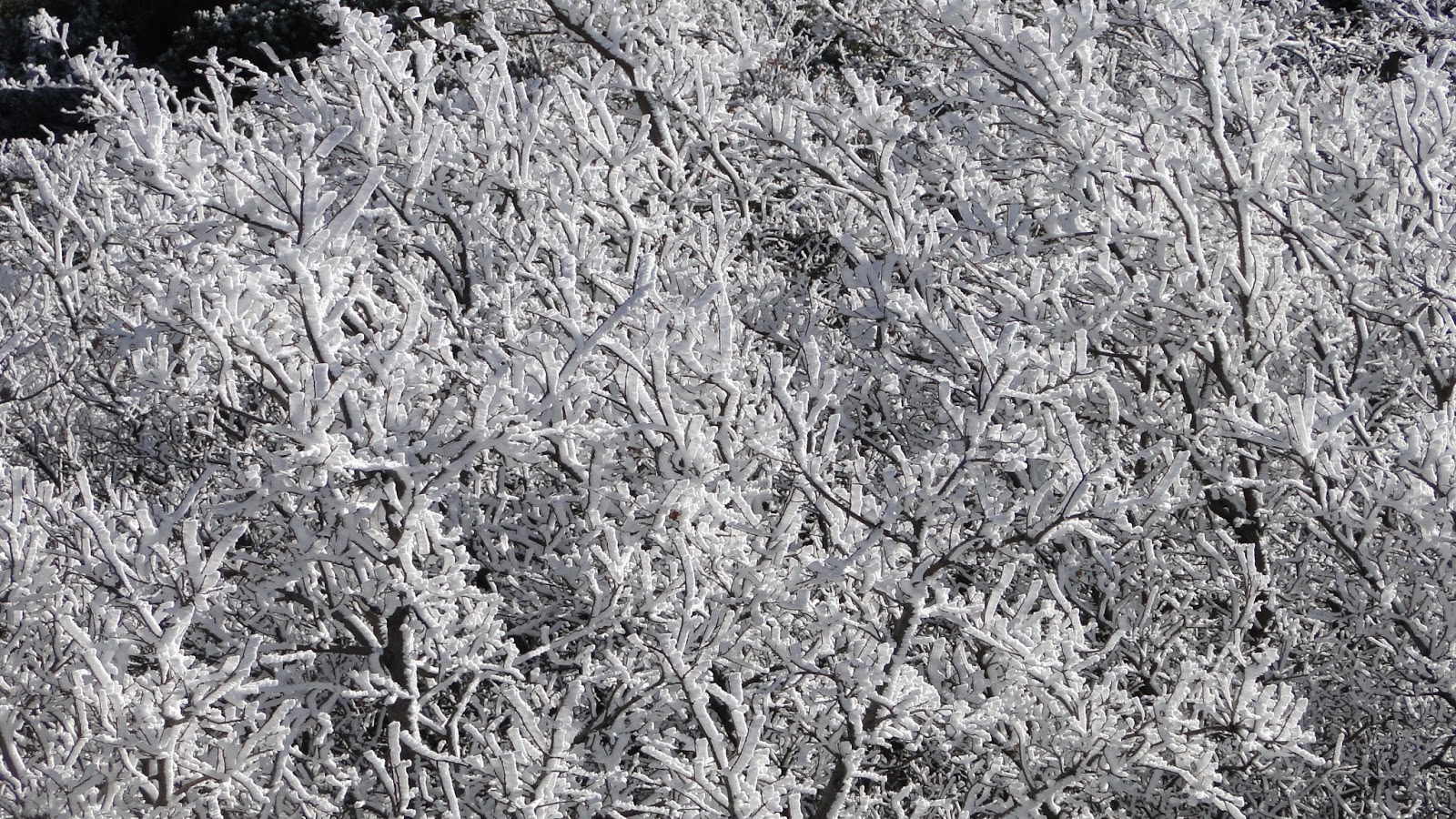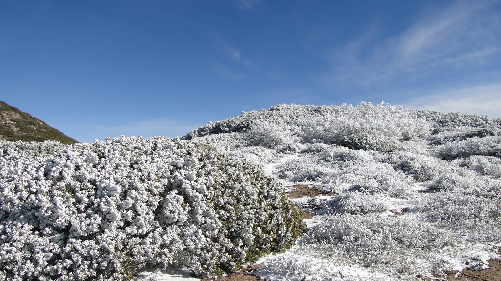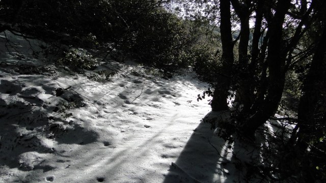 Soon, the trail winds around to a north-facing slope, which supports oak and pine woodland, along with cedars and firs along a few small, seasonal streams. A few inches of snow lay on the ground here, and many of the trees remained iced-over with hoar frost from the freezing temperatures and precipitation of the past few nights. This icy wonderland didn’t last long, since the day warmed up nicely, but during the early morning hours there was plenty of snow and frost to enjoy.