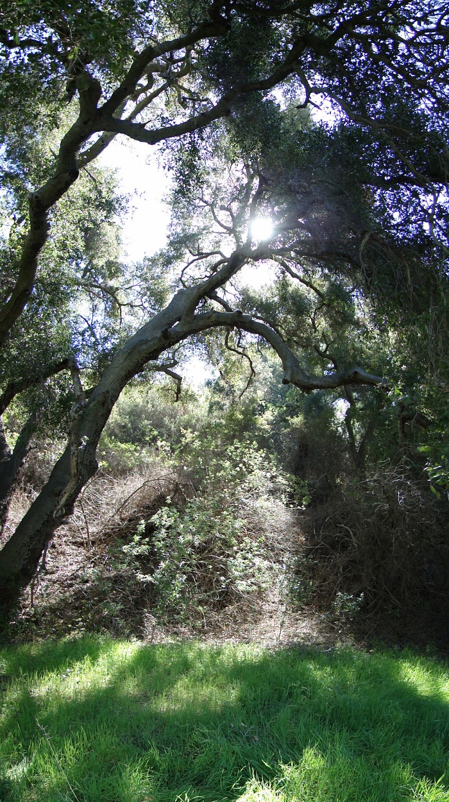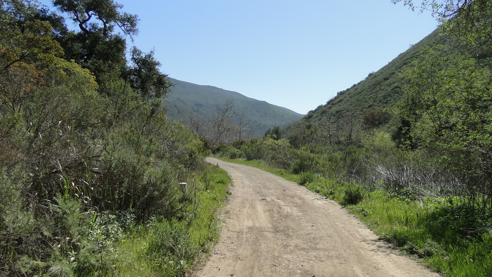 The trail maintains its fire road proportion, but it soon turns to dirt at the Danielsen House. From here, the road will cross sycamore creek a number of times, dart in and out of the shady live oak woodlands, and then roll out into the open, sunny canyon, whose walls gradually diminish in height as you come closer to the sea. At about this point, a cool breeze begins to blow, carrying along with it the smell of the ocean.