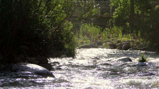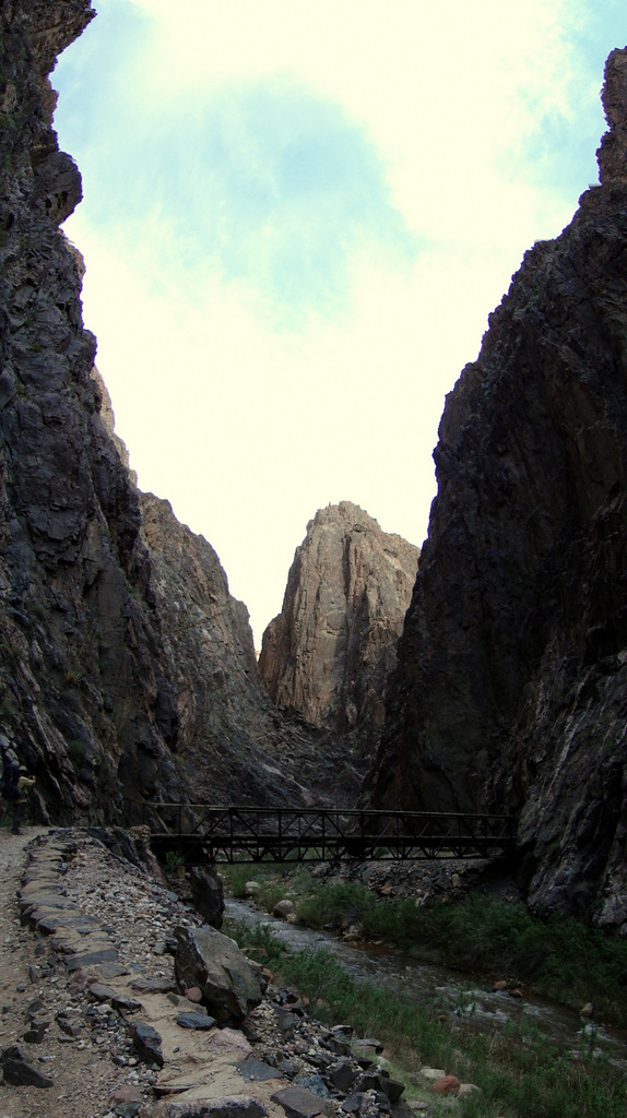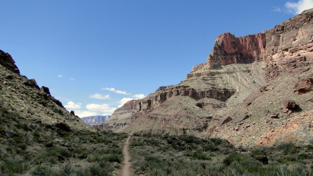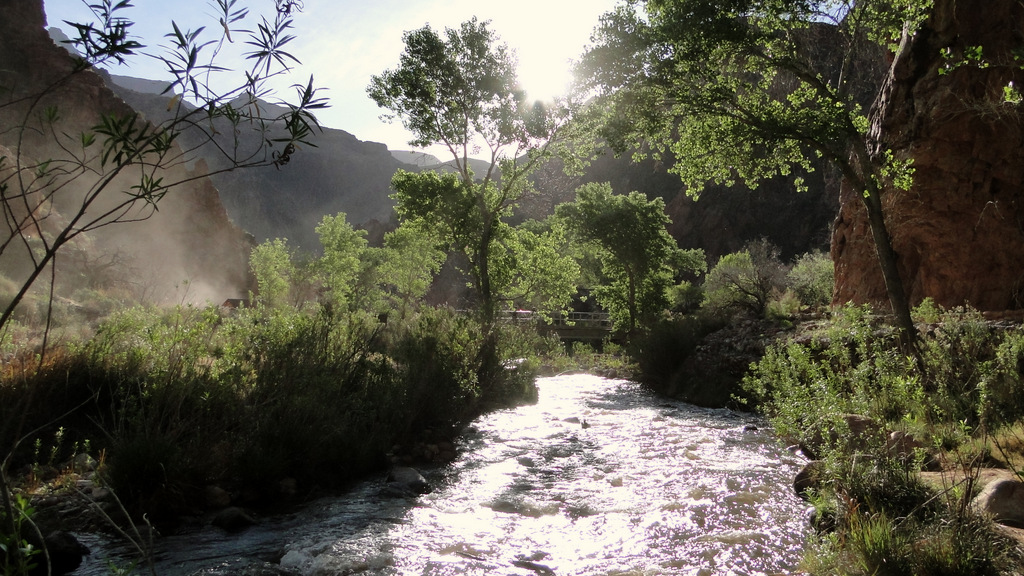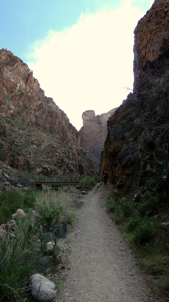 Just past Phantom Ranch, the walls of the canyon close in, forming narrow straights that are often as little as 30 yards wide. This twisting, sinuous section of canyon is known as “The Box” for the sensation it causes of being “boxed” in. The trail runs along narrows shelves on the sides of the canyon, and it frequently crosses the creek on a number of bridges.