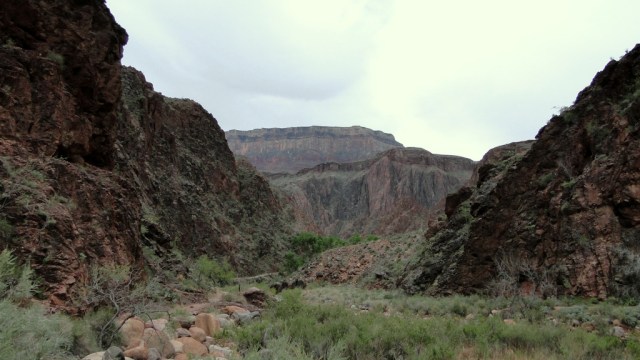 Everything in the box occurs vertically. Buttes tower 1,000 feet above, and the sheer cliffs on both side of the creek block out the sun. This is a dramatic and dizzying section of the canyon that stands in stark contrast to the wide-open vistas experienced on the South Kaibab Trail. It also hints at how different things will be on the north side of the canyon.