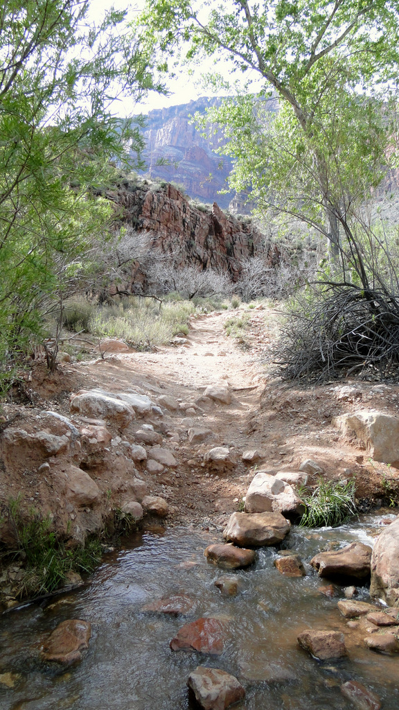 After crossing the river for the final time, we found ourselves on a new stretch of trail – at least for us. On the other side of the Colorado, the Bright Angel Trail clings to a cliff along the river until it comes to a gash in the south side of the canyon created by a trickling stream. The Bright Angel Trail spends most of its lower route alongside or near this creek, although it also spends a good amount of that time switchbacking up to the next level of rock.