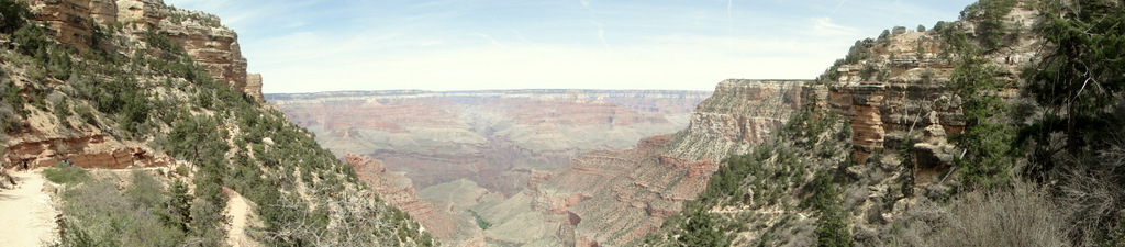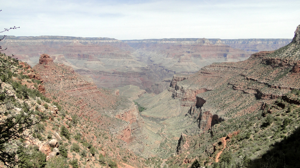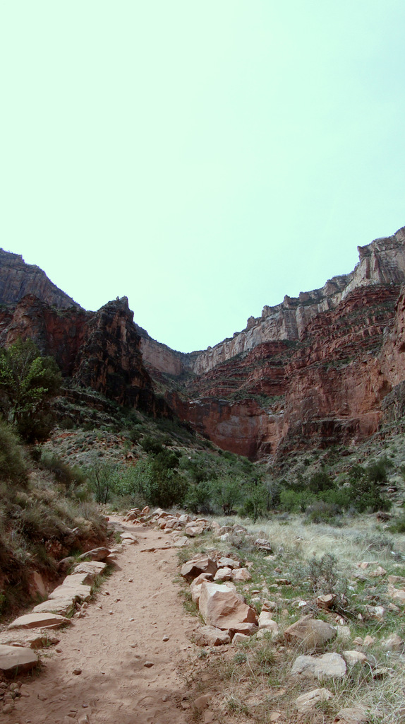 This canyon winds its way upward until the trail emerges on the Tonto Platform. This layer of rock forms a wide shelf upon which a number of additional trails, such as the Tonto Trail, converge near Indian Garden. Indian Garden itself was only a few tenths of a mile away from this point, and, for the first time in a few days, the steep, sheer cliffs of the South Rim loomed directly overhead.