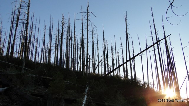 After years of die-off, the forests of San Diego County, especially those of Cuyamaca State Park, began to resemble logs sitting atop more logs sitting atop kindling. Dry conditions and Santa Ana winds created conditions for a catastrophic fire, and the forest was ready to burn. Initially, the Cedar Fire burned west, fueled by hot, dry easterly winds. However, the winds reversed directions in the later stages of the fire, driving the fire directly towards the Laguna Mountains, of which Cuyamaca lies in the center.