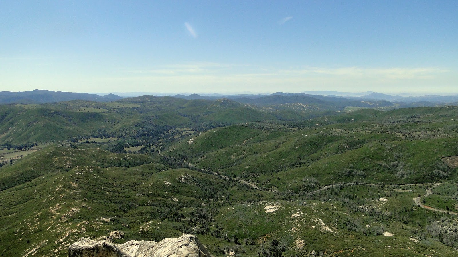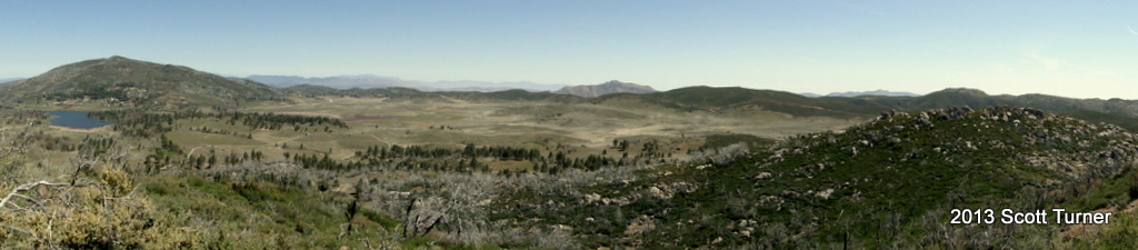 | Looking north at Middle Peak, with Palomar beyond to the left and the Mt. San Jacinto, Hot Springs Mountain, and theSanta Rosas to the right |