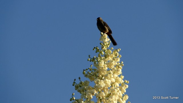 | A bird of some sort perched upon yucca blossoms. |