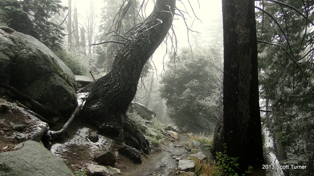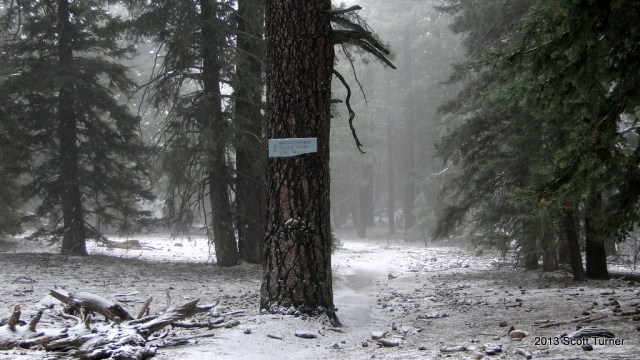 | At the PCT Junction with the Devil’s Slide Trail during a light snow storm. |