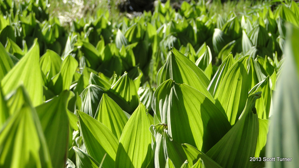| Corn lillies emerging from the ground at Wellmans Cienaga in the San Jacinto Mountains |