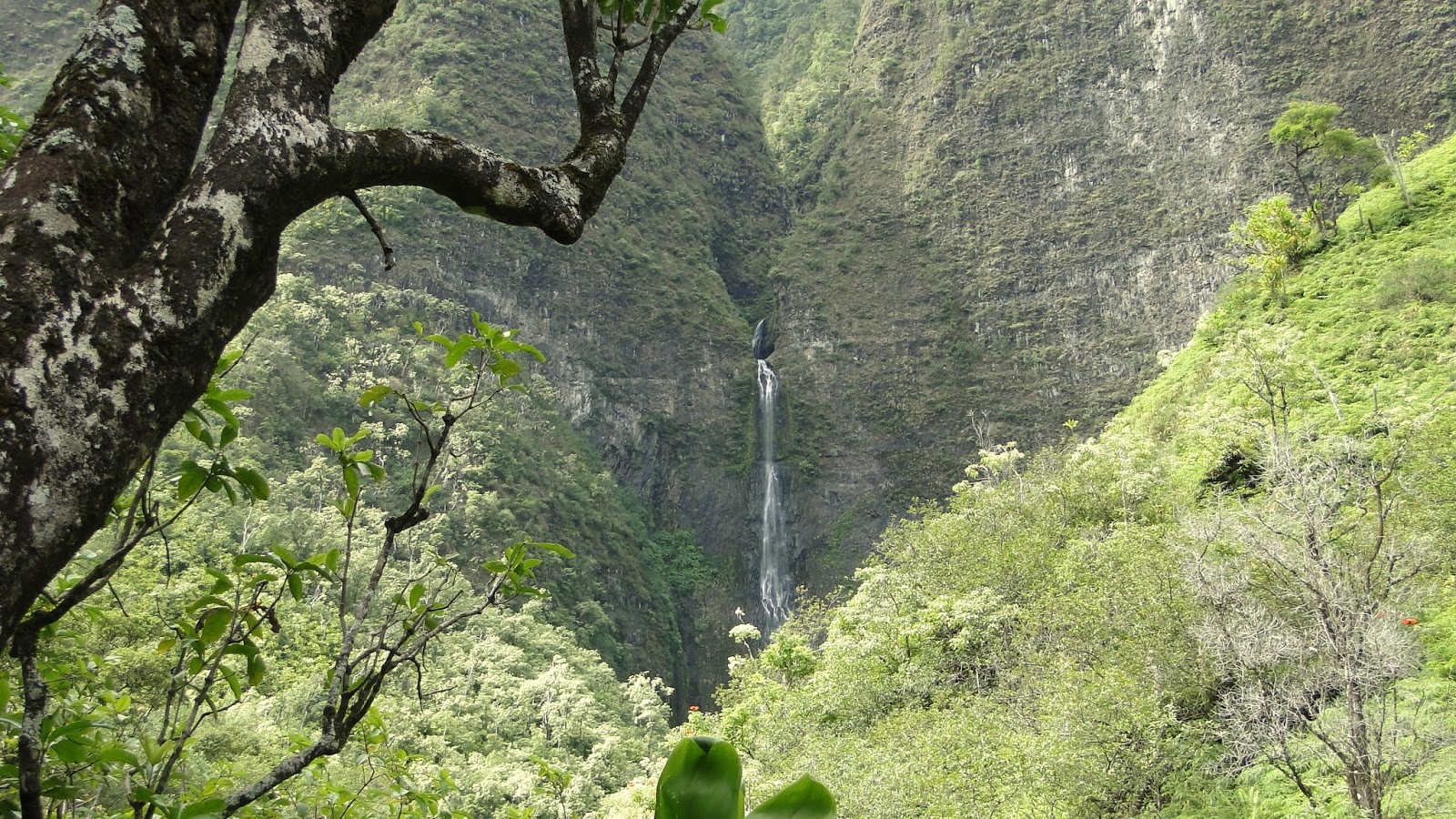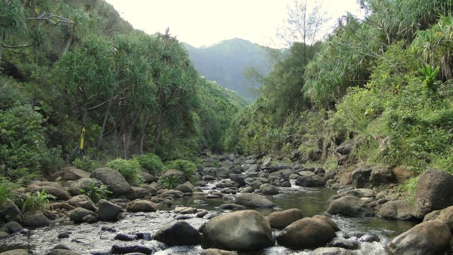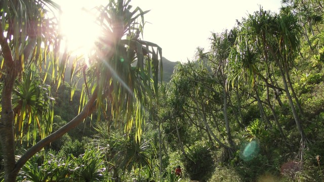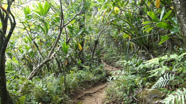 The trail winds into the first valley, which is more of a gulch than a proper valley. The gulch is lined with ferns, screwpines, and ironwood trees, and a creek tumbles down over the rocks. This little valley gives a taste of the jungle to come.