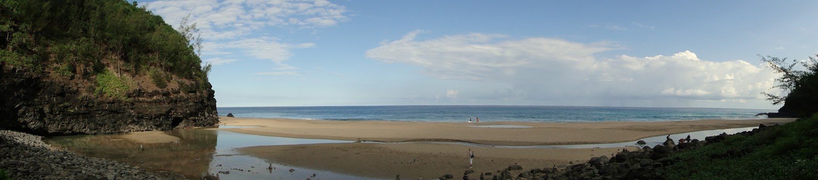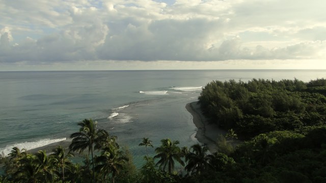 Eventually, the trail yo-yos its way out of this valley and then up and down the next cliff. After a mile and a half of subtle rises and falls, the trail turns a corner on a cliff 600 feet straight up from the ocean and reveals Hanakapi’ai beach, where the valley terminates at an idyllic sandbar with deceptively violent surf.
