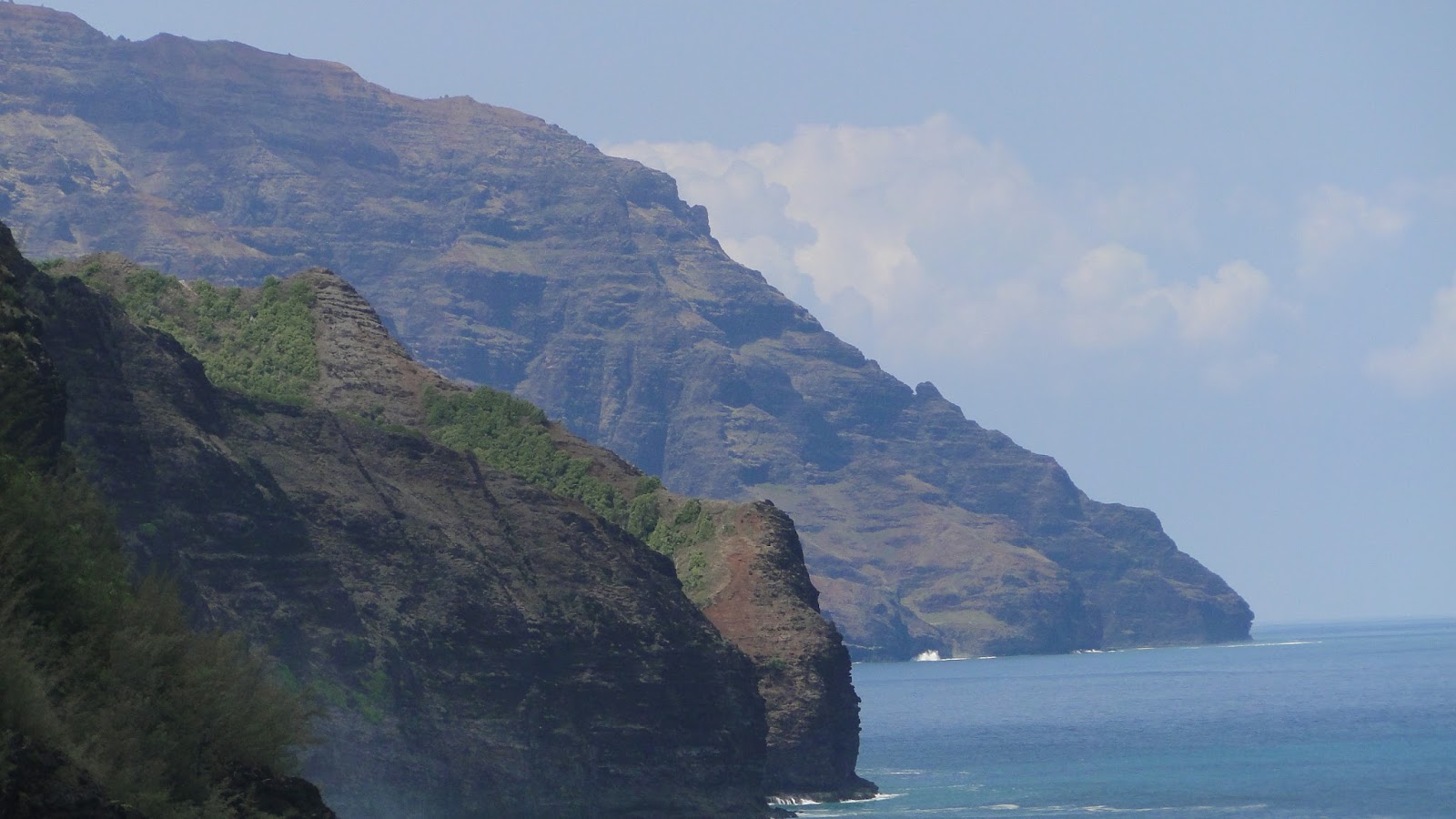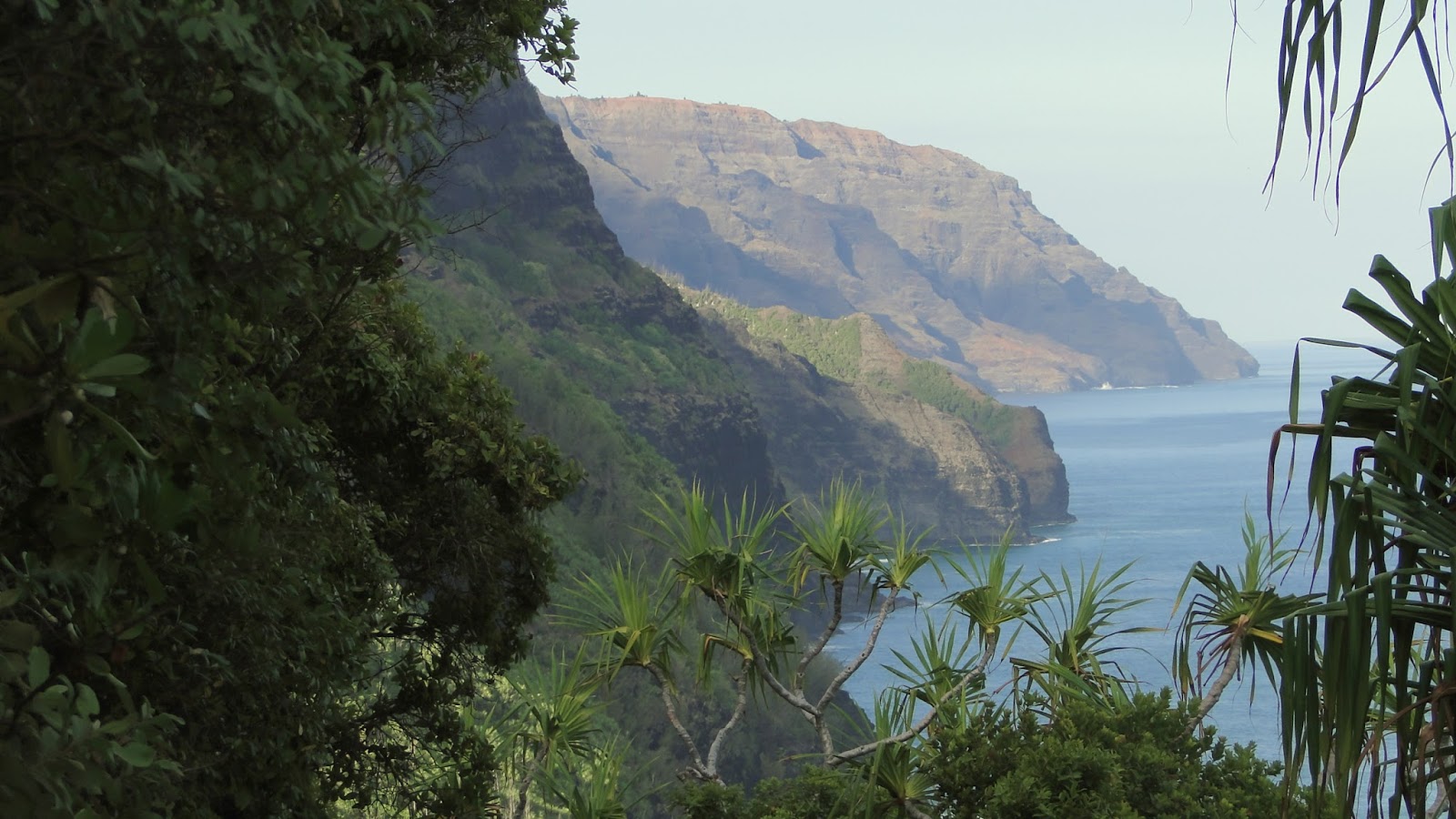 The trail quickly climbs through dense rain forest along the side of a steep cliff. At the top of this cliff, the first noteworthy view of Ke’e Beach opens up to the east. After contouring around a ridge, the first view of the coast emerges, and one can see green, velvet-colored cliffs marching to infinity. All the while, waves roar against the rocky coast and the deep blue pacific merges into the horizon.
