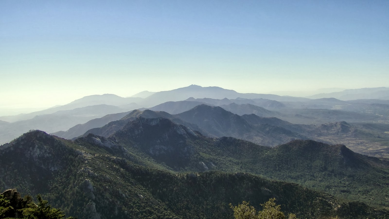 | The Desert Divide and Santa Rosa Mountains from the lookout. The peak (Spitler) in the dead center of the shotwas thoroughly scorched during the recent Mountain Fire. |