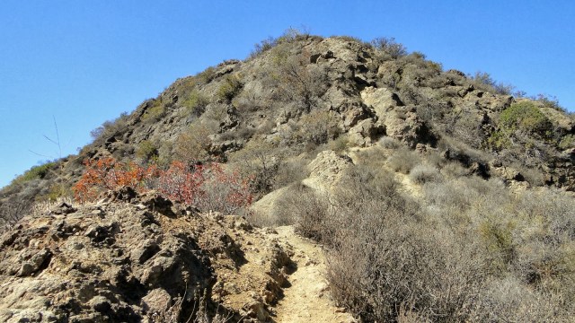 | The trail disappears into a large rock formation that requires a rigorous climb |