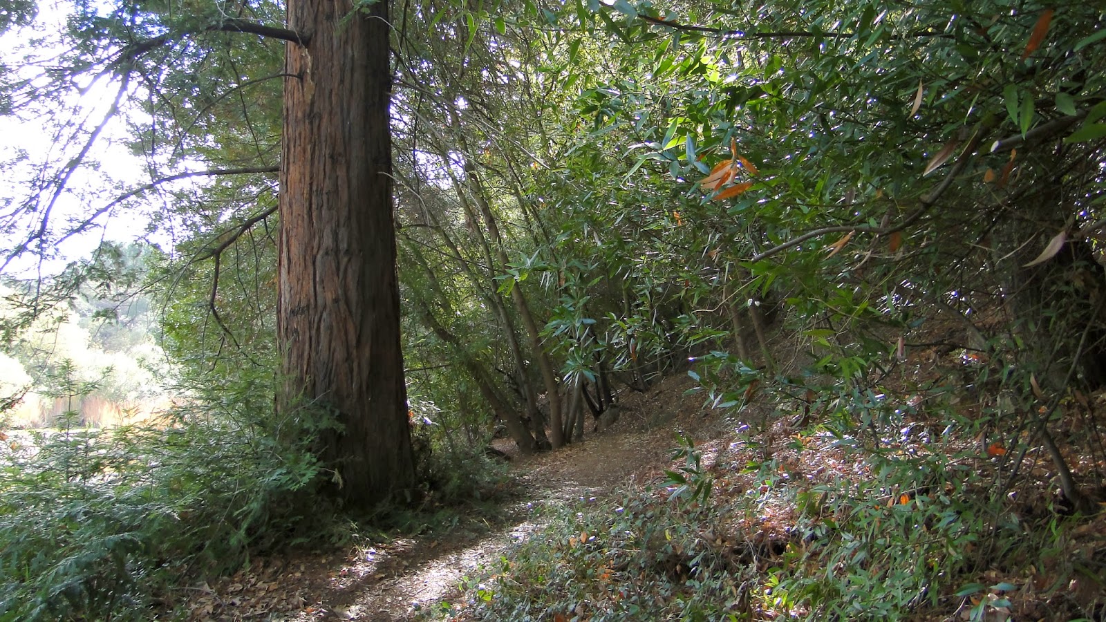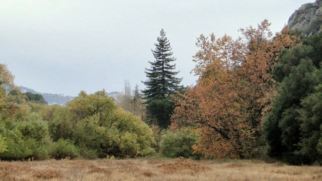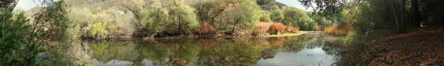 Century Lake was formed around the turn of the 20th century when the original land owners dammed off Malibu Creek. They planted a row of coast redwoods along the south bank of the creek, and now the hundred year old trees have grown substantially. One tree stands at what appears to be at least 80-100 feet. All around these trees are massive spreading live oaks with a smaller, but denser understory of bay laurel. This dense patch of woodland creates the “forest” for which this trail is named.