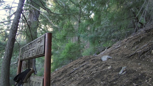 The going is relatively easy along the Gabrielinio Trail until it reaches Spruce Grove campground, which is an awesome trail camp with fire pits, restrooms, and a merrily-singing creek just below. The real work begins on the Sturtevant Trail, which climbs 2600′ over 3 miles to the flat summit of Mt. Wilson. Fortunately, this occurs almost entirely on the wooded north slope of a ridge, which spares the hiker from the dual cruelties of relentless slopes and sun exposure. On this day, the trail was still cold and damp, and at about 4,500′, I saw the first traces of snow lying in shaded patches.