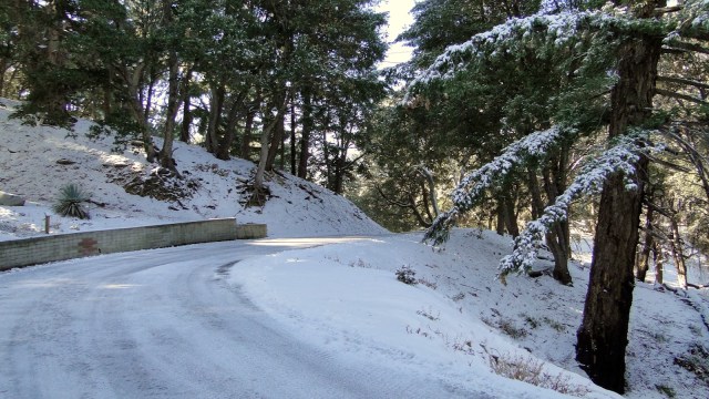 I followed the recently plowed road from the telescopes to the parking lot where the trailhead for Mt. Wilson Toll Road lies. Along the way, I enjoyed a thin blanket of snow that persisted on the shaded north slope of the ridge. I know the snow won’t last as the weather is expected to warm up again, but it was nice to enjoy a last day of Fall that looked decidedly like winter.
