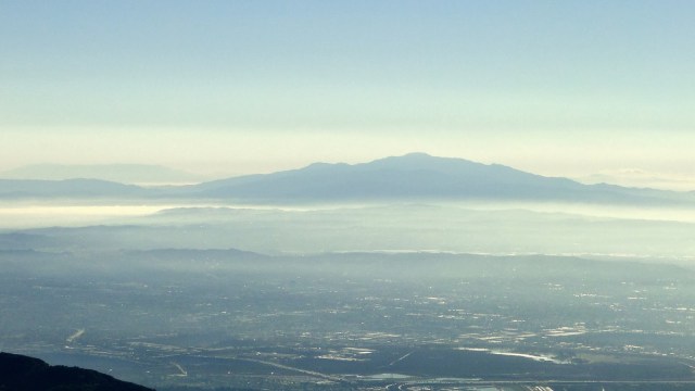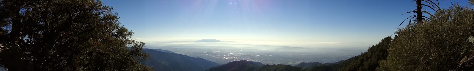 As the trail comes closer to the summit, it rounds the edge of the ridge onto less wooded terrain, revealing expansive views of the Los Angeles basin, as well as the Peninsular Ranges to the south. Spectacular views of the high country of the San Gabriels open to the east, and Mt. Baldy loomed large with its fresh coat of snow. The air was hazy from evaporating moisture over the basin, but the mountains sparkled with pristine clarity from a storm that scrubbed the atmosphere clean.