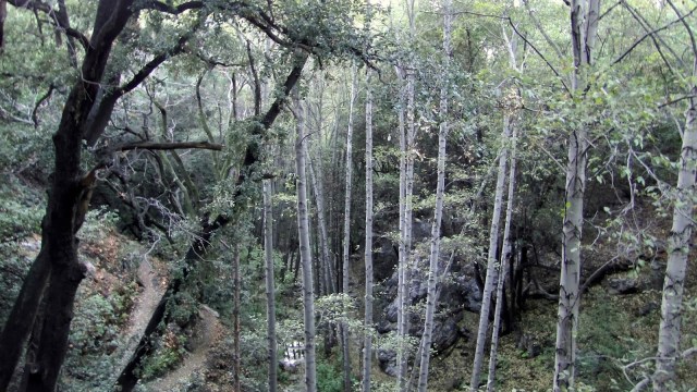 After the half-mile stroll along Mt. Wilson’s long, flat ridge, I headed down the Mt. Wilson Toll Road to its junction with the trail that runs along the south slope of Winter Creek Canyon. This delightfully shaded trail is punishing to the knees going down and equally punishing to the leg muscles going up, but it is a fast, efficient, and temperate way to get back down the mountain. The scenery is somewhat monotonous due to the uniform forest of canyon live oak and bigcone Douglas fir, but the monotony is conducive to getting lost in thoughtful reverie.