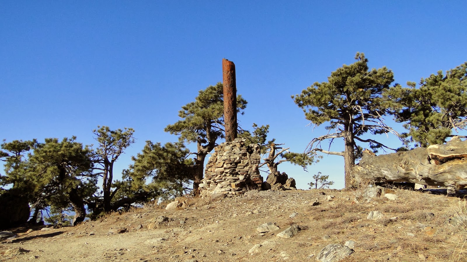 The actual summit is a bit anti-climactic as far as summits go. This summit is a wide, flat, sunny area rimmed by Jeffrey pines. The trees largely obscure panoramic views, and one must wander to soak in the full scope of the terrain thousands of feet below. There are also a cluster of campsites at the summit, which is highly unusual for a peak this size. One will find the ruins of an old log cabin, all of which that remains is a massive stone fireplace and rusted iron chimney. This would be a great place to camp due to the epic views in every direction.