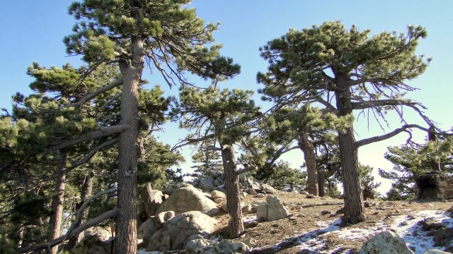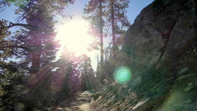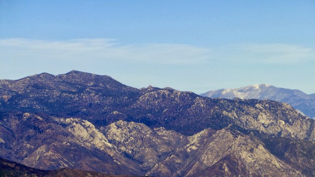 I chose to start at 6800′, which is about where the mixed-conifer forest emerges in earnest. This afforded me the opportunity to walk in the shade, which I found more preferable than walking in open, sunny chaparral, even on this cold day. This is a pretty dry forest, which reflects the fact that the mountain is surrounded on three sides by some of the hottest and driest places in the United States. In addition to that, ranges like the Palomar Mountains and Santa Ana Mountains soak up a lot of moisture from Pacific storms before they can reach the higher desert peaks, leaving enough to support a forest but not enough for springs, streams, meadows, and waterfalls like one might find on the coastal facing ranges.