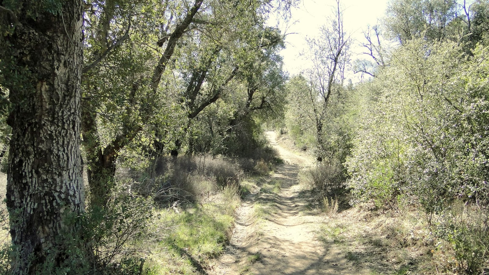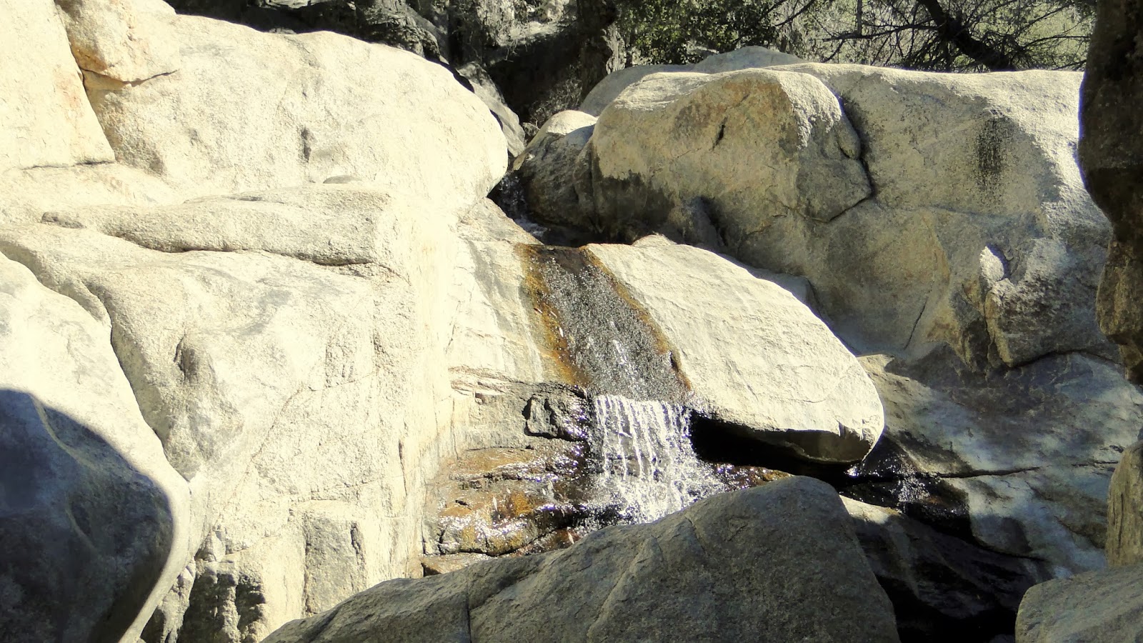 After passing the nice but not remarkable Green Valley Falls, the trail runs at times along the river and at times up above in the brush. After descending into a valley, the trail hits a junction with a towering Jeffrey pine and then turns right and begins to climb. After crossing the river again, the trail climbs up a shallow ravine drained by a now-dry creek. The woodlands around this creek are demonstrating how well oaks recovery from fire. Ten years later, and each fire-scarred tree is looking about halfway to being good as new.