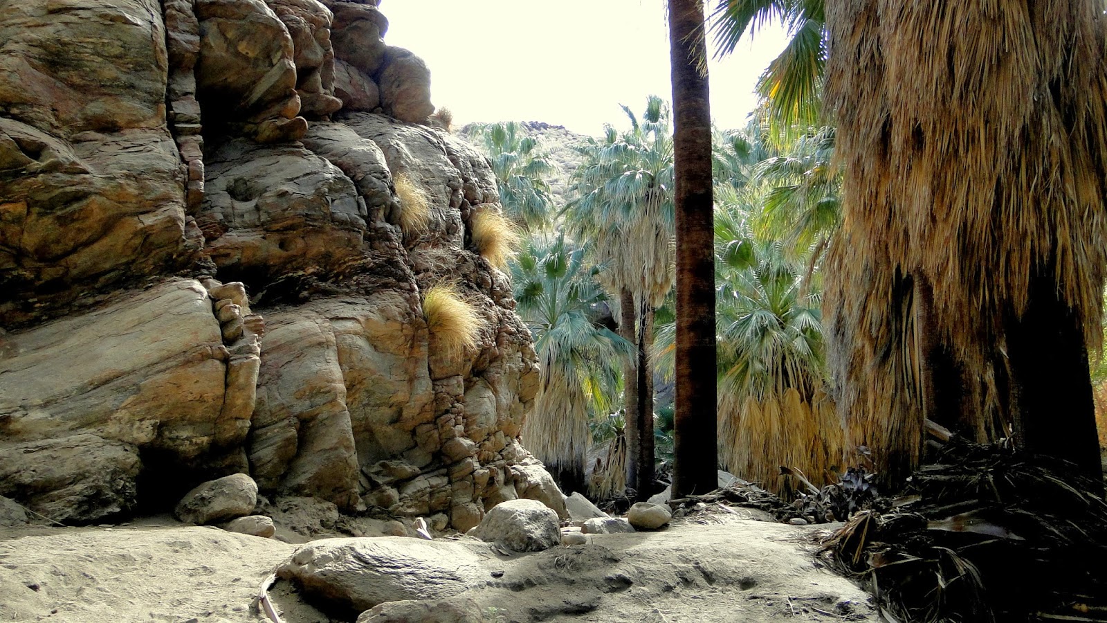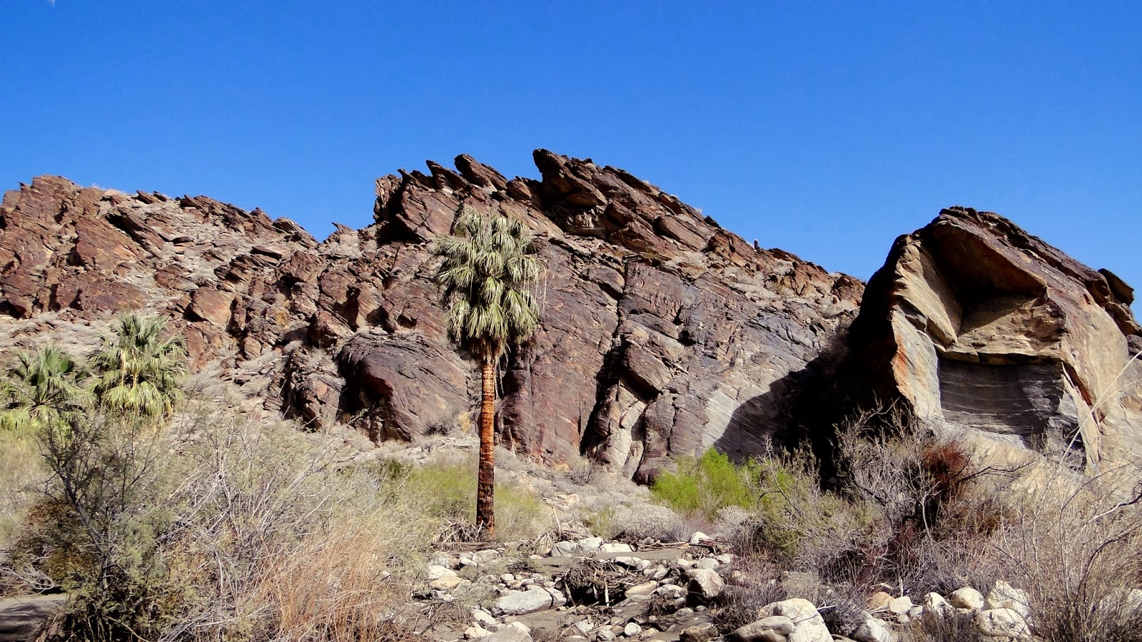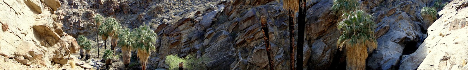 The tropical feel of these canyon bottoms is largely created by an abundance of native California fan palms, which I wrote about here. These oases are not common in Southern California, occurring mostly in the Coachella Valley, Anza-Borrego Desert State Park, and in a few places in Joshua Tree National Park. As these particular oases are on Native American reservation land, they remain well-protected from the intrusions of modern civilization.
