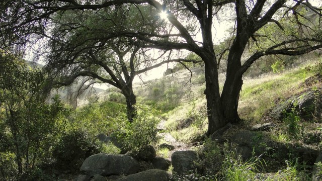 The trail commences by dropping a fast 200 feet to the bottom of the canyon where Santa Ysabel either roars, trickles, or sits bone dry. This shady section currently has a modest trickle of water, which pools up in certain nooks and crannies to provide a habitat for frogs that croak vociferously as the sun descends. After the creek, the trail begins ascending unremittingly through grassy slopes punctuating with chaparral shrubs and granite boulders.