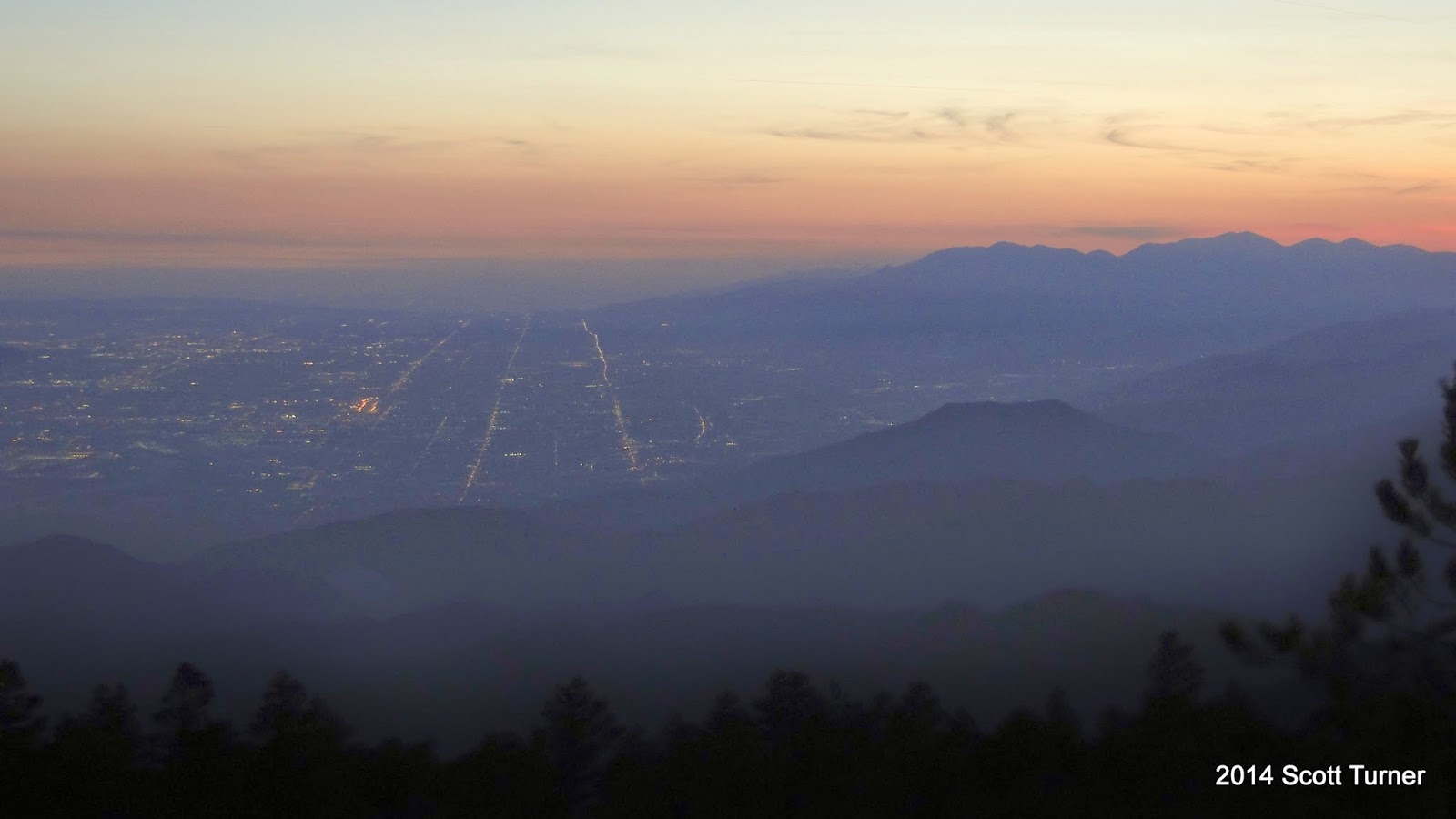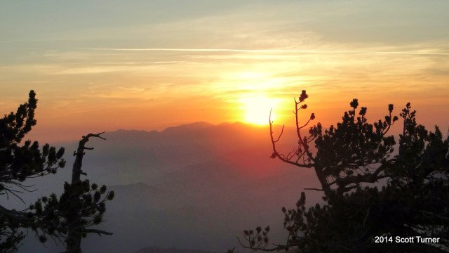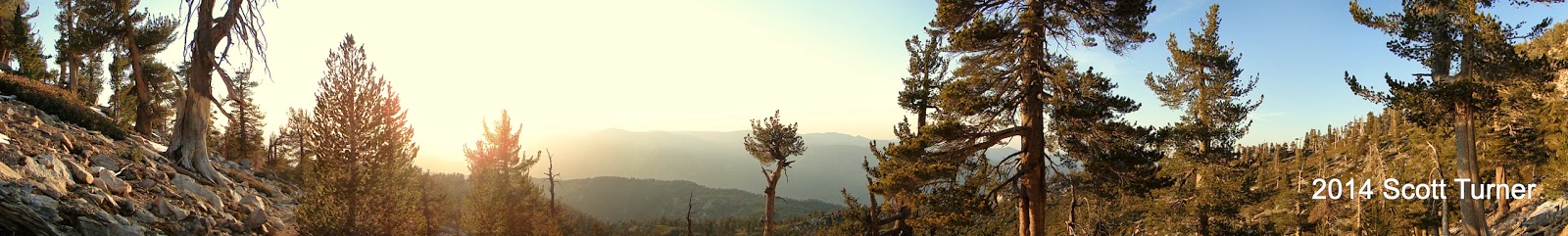 Limber Pine Bench slopes gently down a flat-ish section of the mountain. This space features a number of twisted and flagged limber pines, which get their name from their flexible branches. Many camping spots with sheltering rock walls dot this gentle slope, and Kyle and I chose the best one closest to a cliff offering views over Mt. Baldy and San Bernadino. The sunset, aided by the Etiwanda Fire, was quite vivid.