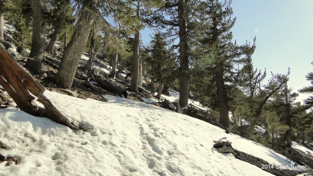 After setting up camp, Kyle and I tanked up at Limber Pine Springs, which was flowing weakly and was still mostly snowbound. We ran into the iciest and deepest patches of snow on the trail here, and Kyle decided to remain at camp due to lacking microspikes and not wishing to take chances. I felt a little more comfortable and decided to press on up the peak.