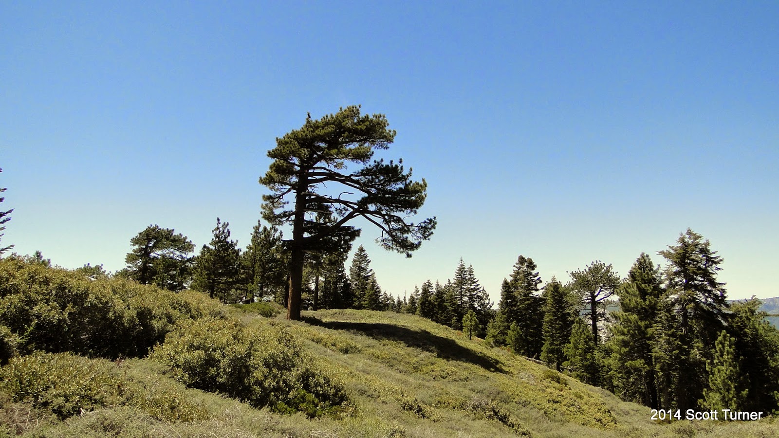 The trail reaches a junction toward Johns Meadow and Columbine Spring. After enjoying a lunch of dried mango, peanut butter cups, and a Clif bar, we began to climb again up through a transition zone from Jeffrey pine, sugar pine and white fir to limber and lodgepole pines. After winding up through sparsely forested mountain-sides with ever expanding views, we came to a sign and a path leading off to Limber Pine Bench.